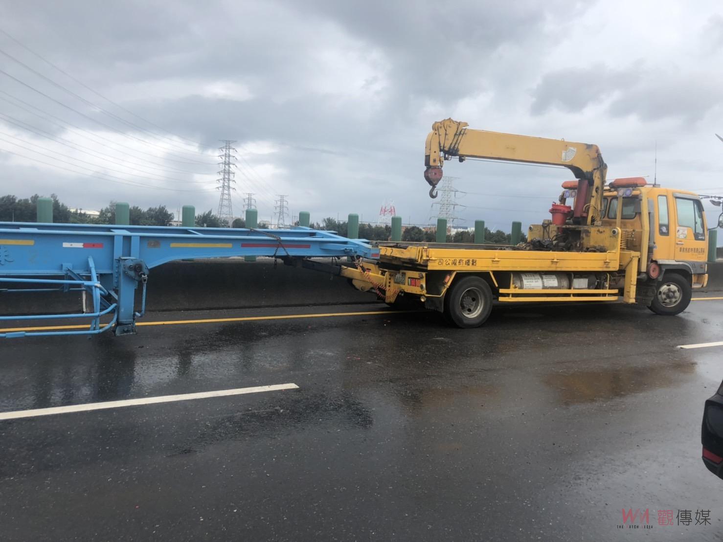 ▲台61線西濱快速道路彰化線西路段傳出貨櫃車「折甘蔗」意外,由於貨櫃自撞外側護欄,整個貨櫃90度橫躺路面,貨櫃佔用整個北上車道。