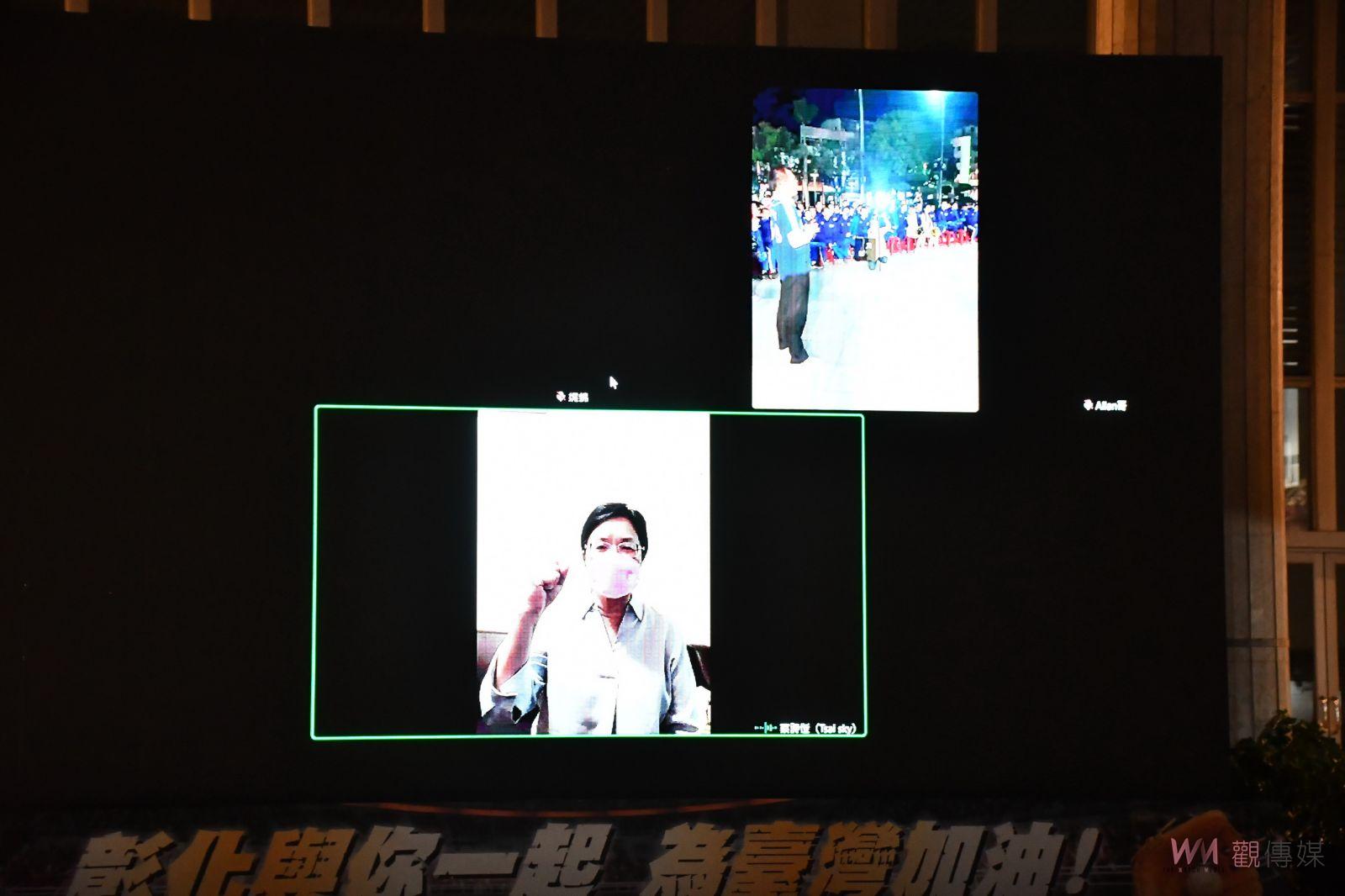 ▲赴日本考察行銷彰化優鮮農特產品的彰化縣長王惠美,也遠從海外連線驚喜現身,與在現場鄉親一起加油。