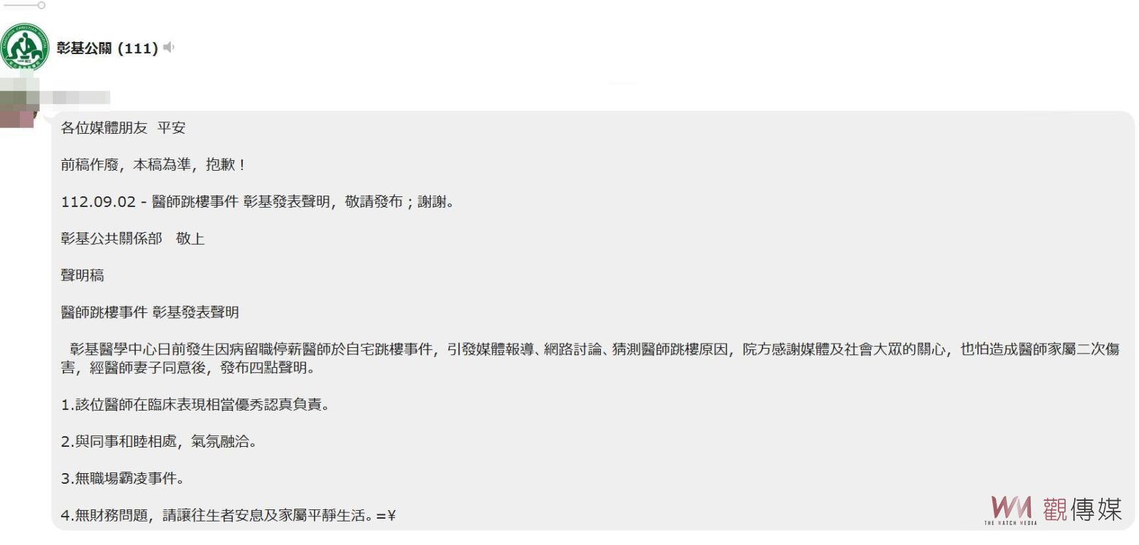 彰基發布四點聲明:1.該位醫師在臨床表現相當優秀認真負責。2.與同事和睦相處,氣氛融洽。3.無職場霸凌事件。4.無財務問題,請讓往生者安息及家屬平靜生活。