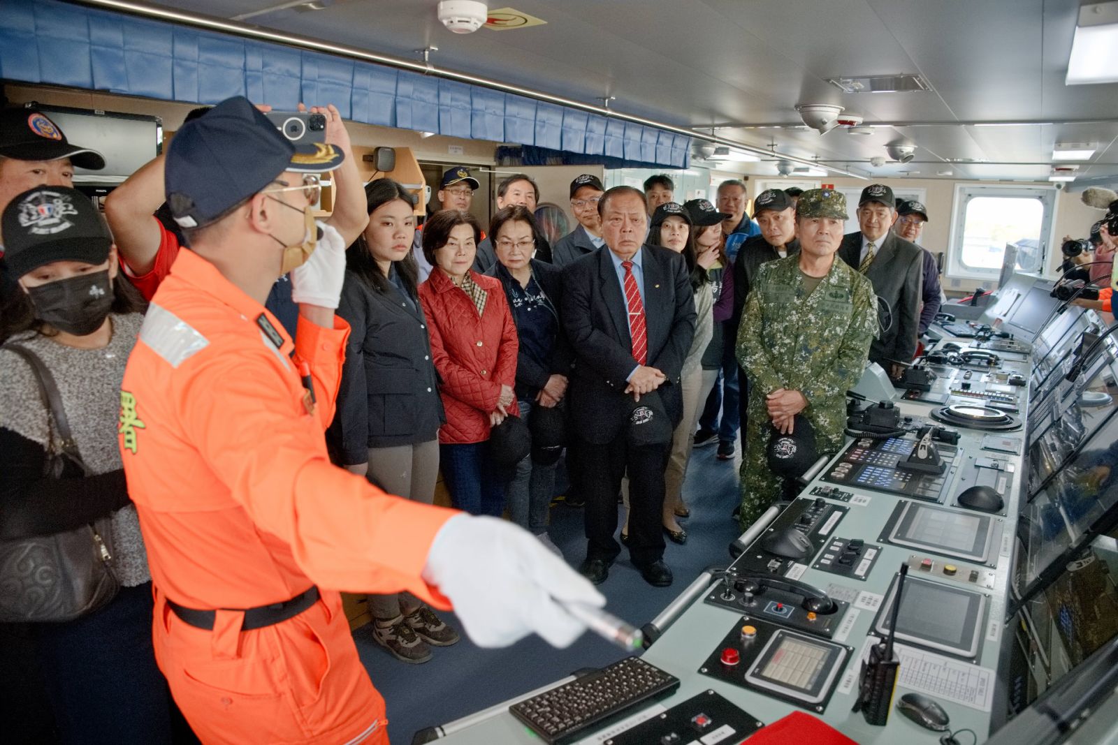 ▲首航典禮後,海巡人員引導參觀連江艦各項先進設施,澎湖縣長陳光復、澎防部指揮官郭俊德等人登艦參觀。