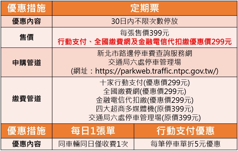第2重「路邊機車停車定期票」,每張定價新臺幣399元;民眾可自行選擇啟用日,於30日內不限次數、路段停放於新北市路邊機車停車格停好停滿;民眾可自7月22日起至新北市路邊停車費查詢服務網(https://parkweb.traffic.ntpc.gov.tw/)申購定期票。