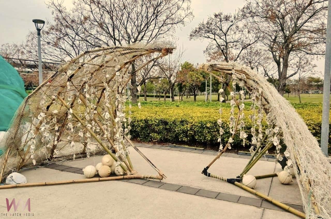 「海」以「竹浪之聲」—巧妙融合蚵殼、廢棄漁網等海洋廢棄物,透過光影變化呈現海浪的律動,讓人彷彿置身於海濱潮汐間。作品不僅展示海洋與人類共生的可能性,也提醒大眾關注漁業資源與海洋環境永續的重要性。