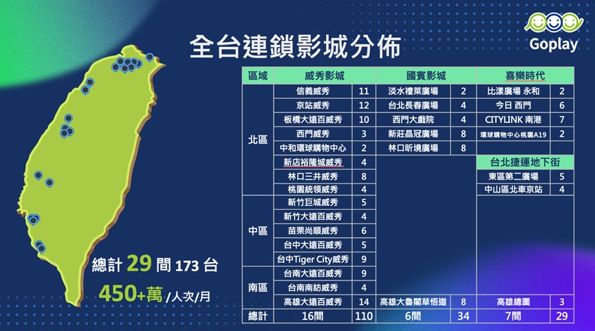 為此,Goplay Media 已與 威秀影城、國賓影城、喜樂時代影城 等多家院線建立合作關係,覆蓋北中南主要商圈與娛樂熱區。品牌可依據目標族群特性靈活選擇投放地點與時段,打造更具策略性的曝光佈局。