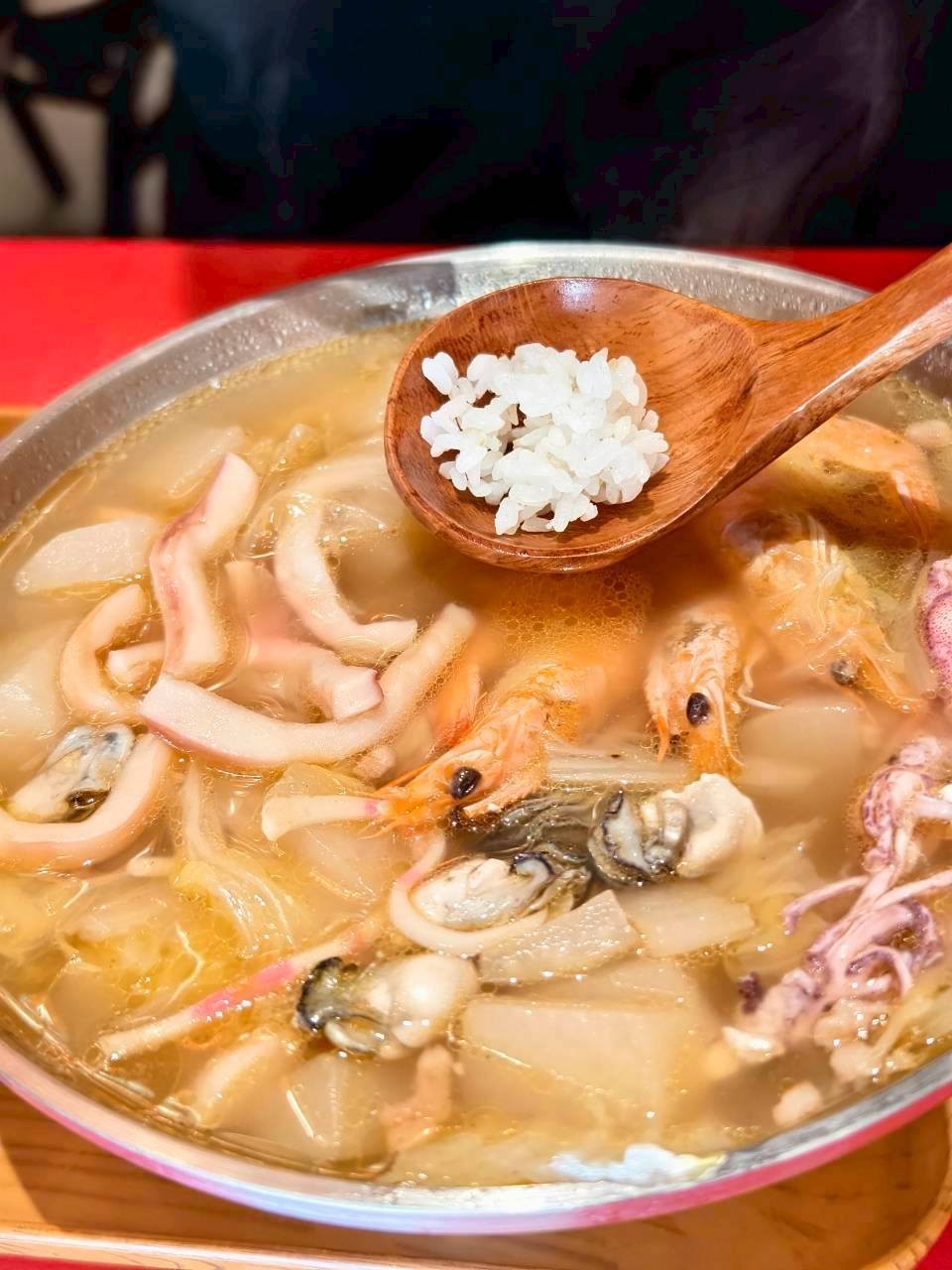 據了解,店家的海鮮飯湯以大容量 950 ml 大碗盛裝,遠超一般市售湯品規格。碗面鋪滿蝦子、小卷、蚵仔、干貝、豬肉片與香菇,幾乎看不見湯面。視覺效果宛如一鍋迷你海鮮鍋物,份量明顯高於一般主食。