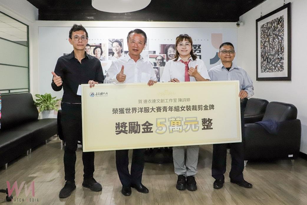 (觀傳媒嘉義新聞)【記者吳東林/嘉縣報導】嘉義青年展現國際頂尖實力!在地青創品牌「連衣連文創工作室」負責人陳詩婷代表台灣前往韓國參加「裁縫界奧斯卡」世界洋服大賽,勇奪第40屆「女裝裁剪比賽」青年組金牌。嘉義縣長翁章梁今24日頒發獎勵金5萬元,陳詩婷也為縣長量身,將製作一套專屬西裝回贈。