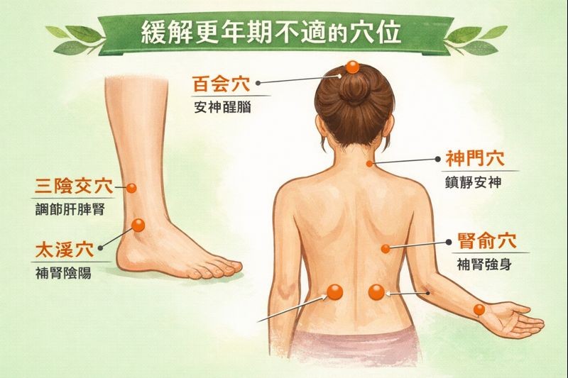 三陰交穴:調節肝脾腎功能,改善潮熱與情緒波動。