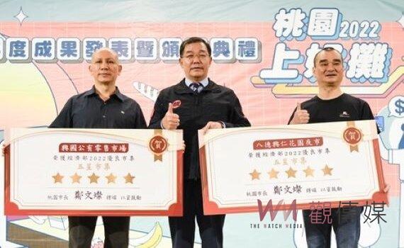 (桃園新聞)【觀傳媒記者潘明賜/桃園報導】2022桃園上好攤年度成果發表暨頒獎典禮,今(7)日下午在桃園市綜合會議廳舉行。市府秘書長黃治峯代表市府頒發經濟部樂活名攤評鑑獎項,並由經發局長郭裕信頒發桃園上好攤獎項,鼓勵獲獎的市場及攤商。黃治峯指出,今年桃園上好攤以「這味我最推!」為主題,共有421攤角逐榮耀,為歷年參與最踴躍的一屆,歷經兩階段激烈評選,產生32個獎項得主、總獎金高達30萬元。