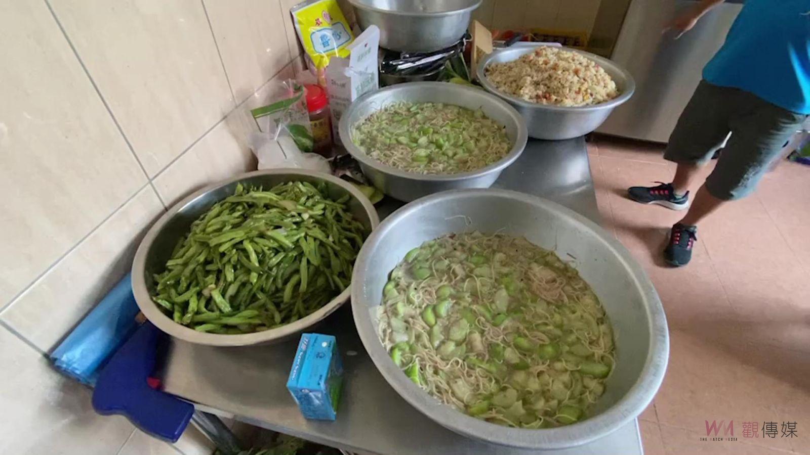 水尾社區「幸福食堂」今(2)日菜色炒高麗菜、炒蟹肉金菇絲瓜、炒菜豆、油豆腐、滷雞腿和炒麵、菜飯、冬瓜湯,蔬食四選三,主食二選一,搭主食和湯品,菜色與分量都相當豐盛,尤其食物偏軟爛,適合牙口不好的高齡村民。
